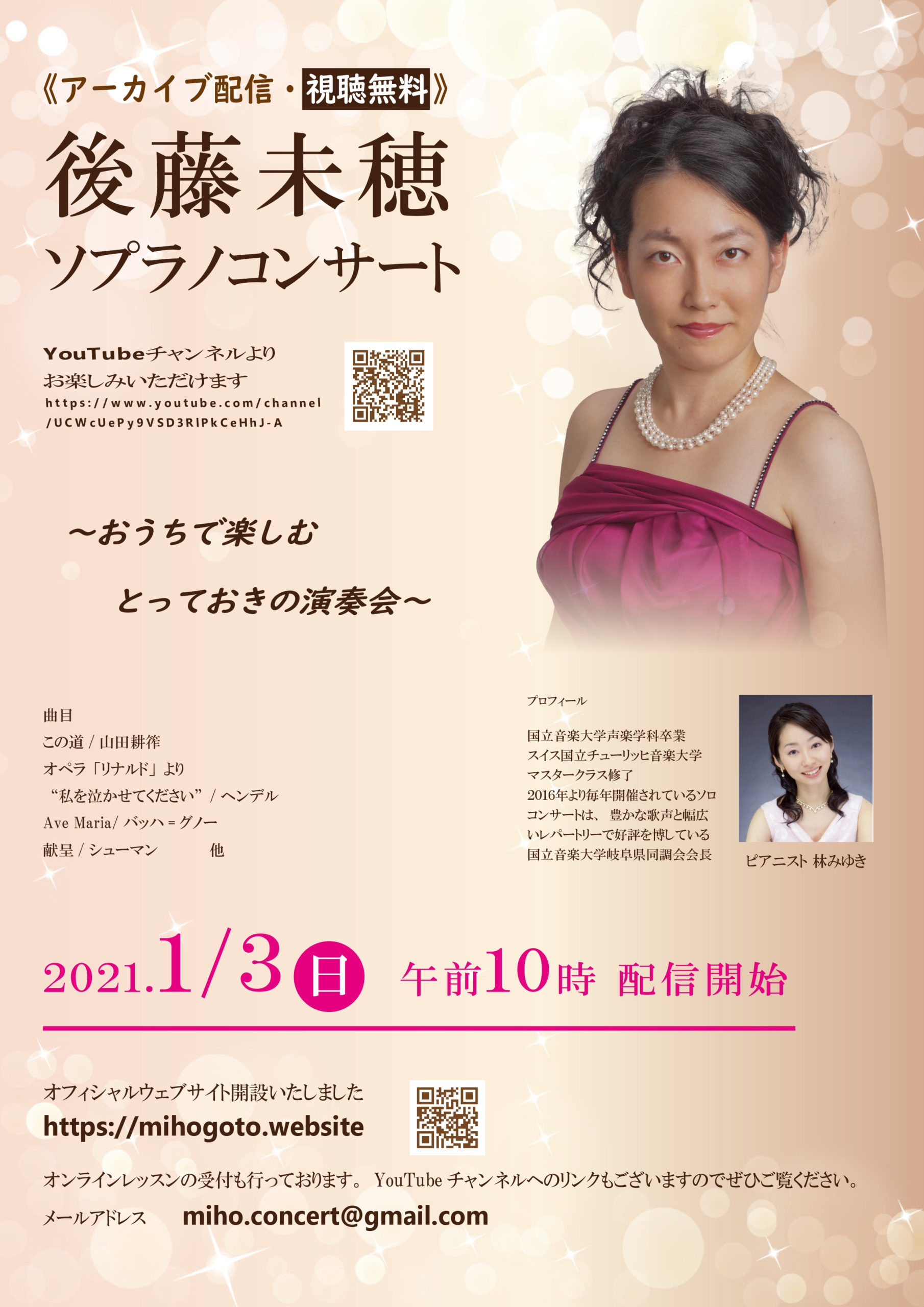 コロナウイルスによる影響でコンサートの開催も難しい中、音楽を通じて少しでもみなさまとつながりたいと思い、ウェブサイトを開設いたしました。